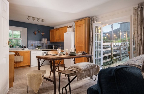 Layout.... Mill Corner has it's own key safe. Private entrance consists of french double doors. Entrance hall provides plenty of space for boots and coats. A bookshelf of reading material and games greets you on arrival. On the ground floor you will find a large master bedroom with double french doors that open out into the garden. A set of stairs lead you up to the top floor where you will find the second spacious bright bedroom. It is arranged as a twin but can be made to a double on request. Both bedrooms have ensuite bathrooms. An extra toilet is located off the upstairs hallway. From the hallway you enter into an open plan living/dining/kitchen area. There is plenty of space for 4-6 people to dine. Kitchen comes fully equipped with electric oven/hob. Fridge freezer, dishwasher and washer/dryer. From the dining area double french doors open out onto the upper deck area giving an indoor/outdoor dining experience. Alternatively, enjoy the full alfresco experience and take your mealtimes out into the garden.