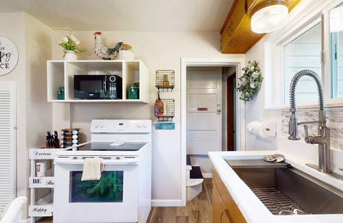 Inside, find a cozy living space with plush furnishings and a wood-burning stove. The kitchen offers all you need to create your favorite meals. Added perks of this charming cottage include board games, complimentary high-speed WiFi, and a washer/dryer.