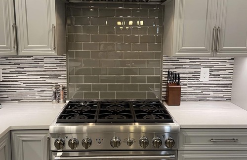 The fully equipped gourmet kitchen features commercial grade Thermador appliances that include a gas stove and oven, dishwasher and large capacity refrigerator. Additional kitchen amenities include a microwave oven, Keurig duo coffee maker and many other kitchen appliances and utensils.