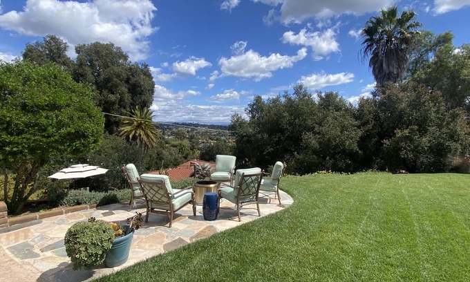 Unwind in our 1 bedroom guest suite located in a lush 1 acre property nestled on a private road hilltop. Enjoy beautiful mountain views under a shady, extra large old Fig tree or on the fire pit area. Mingle with the chickens in their own large coup or swing under the fig tree. Drive 25 min to the beach, 10 min to the Wild animal park, 1.3 miles to Trader Joe’s grocery store or simply enjoy a 1 mile walk around the neighborhood loop. Relax in comfortable beds, luxury motorized soft leather recliners, a mini kitchen and a big screen smart TV.