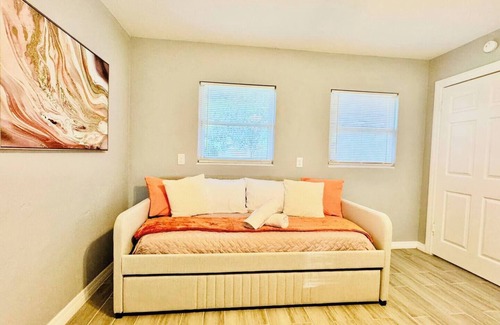 Discover tranquility in our charming duplex, ideally located between Tampa and Orlando. With a separate entrance, this peaceful sanctuary provides the perfect escape while offering unbeatable convenience. Enjoy nearby attractions, sunny days, and ultimate relaxation. Book now for your ideal Florida getaway!