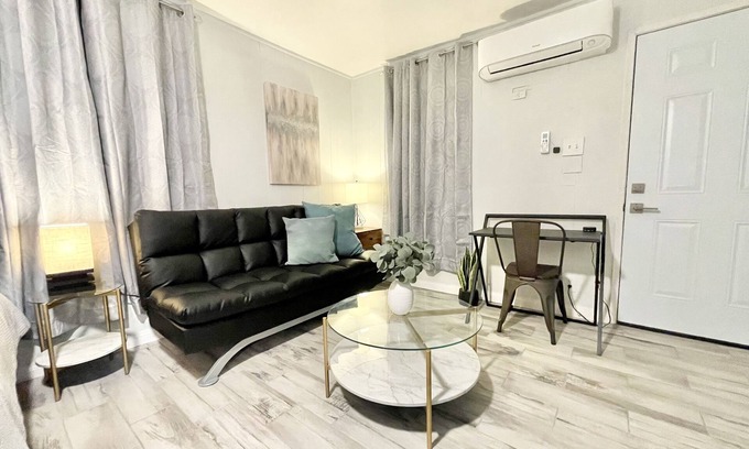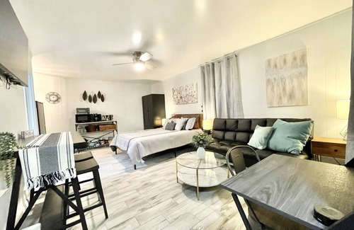 This is a cute 400sf remodeled standalone guest house with private fenced patio. It offers a well stocked kitchenette with brand new appliances, luxurious modern furnishings, ductless AC/heater, 55" smart TV with spectrum TV services, fast mesh network WiFi (~450Mbps), comfortable memory foam queen bed, etc. Keep in mind, the guest house was built in the 50s, so we have updated all electrical, plumbing, floor, ceiling, windows, fixtures, laundry room (separate entrance), etc. However, we still have the original shower stall, door and the original wood paneling to compliment the old farmhouse feels.