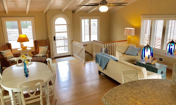 Great room includes fully equipped kitchen with two seat counter, dining area that seats six, corner reading area, living area with Cable TV, Apple TV and Blu-Ray DVD player, large ceiling fan and a covered outdoor deck through double French doors.