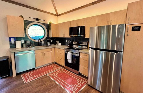 Inside, the full kitchen features a glass-top electric range, full-size fridge and freezer with ice-maker, microwave, drip and Keurig coffee makers (with coffee and K-Cups provided), blender, toaster, rice cooker, everything needed to prepare meals, salt, pepper, and oil.