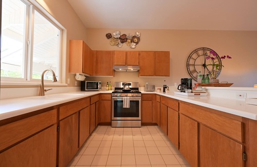 The perfect place to truly getaway & experience a rejuvenating Hawaiian vacation retreat with your significant other, family or friends. Nestled in romantic, old Hawaii in the quaint & friendly coastal community of Kehena Beach Estates, within walking distance (a few blocks) to the exotic, clothing-optional black sand beach you will learn the meaning of relaxation. Awake to the soothing sounds of the ocean, nature’s music night & day. This custom home was designed to take advantage of the prevailing trade winds, which provides comfortable temperatures throughout the day & evening all year round. The open floor plan & many windows frame the tropical treetop views. Mature tropical landscaping grows all around with specimen bamboo, avocado, palms, banana, citrus & ginger. Environmentalists will appreciate the water catchment system & solar water heating that service the entire property. We provide desk & chairs, WIFI, Roku on TV for streaming video like Netflix or Amazon & the bonus USB plugs. The Hawaiian style layout & separate entrances allow for privacy or group entertaining for families & friends alike. Meander through the indoor & outdoor spaces including separate living areas, lounge the hammock, enjoy a backyard shower on the lower most lanai.