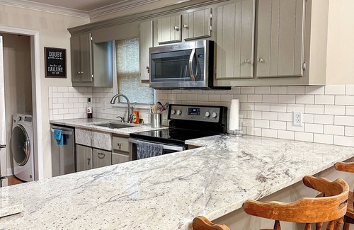 Our fully stocked kitchen has everything for home-cooked meals, plus a dining table, bar with stools, and a high-top table on the back deck—ideal for morning coffee, al fresco dining, or curling up with a book. Essentials like shampoo, conditioner, bath soap, toilet paper, hand soap, dish soap, sponge, and paper towels are provided. Unwind with 3 smart TVs loaded with free shows and movies, plus fiber Wi-Fi for streaming or working!