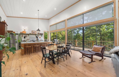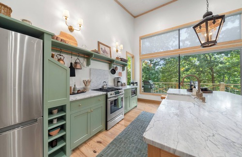 As you step inside, you’re greeted by gorgeous pine wood flooring and natural sunlight streaming through the floor-to-ceiling windows in the living and kitchen areas, offering breathtaking views. Whether you're enjoying the fire indoors or outdoors, the atmosphere is cozy year-round. The kitchen is truly the heart of the home, featuring a large island, Carrara marble countertops, unlacquered brass fixtures, custom cabinetry, and unique handmade dishes.