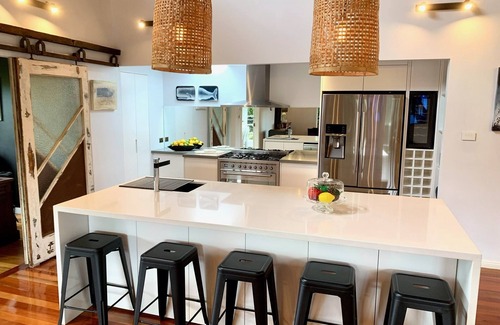The property is modern and fresh creating a fabulous space to relax and enjoy great company. This lush open plan design of the lodge with its floor to ceiling windows and doors bring in soft northern and eastly light. The fully equipped kitchen has a huge stone island bench. It also features a butler's pantry with modern appliances. This then spills out to an open plan living area with leather lounges, smart TV and dinning table to comfortably seat eight. Fully ducted air conditioned for easy heating and cooling.
