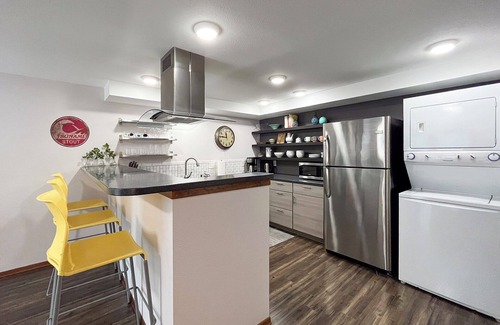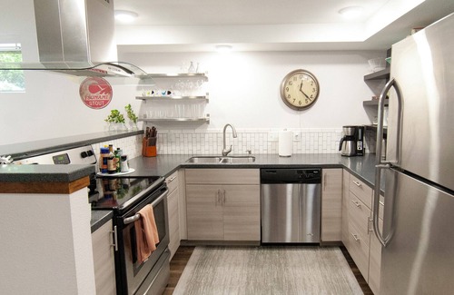 Modern, bright and airy lower-level unit with a large, open living, dining and kitchen area and all the amenities you need to live, work and explore Portland. Make your meals in the full size kitchen stocked with coffee, tea, olive oil and other condiments. Two bedrooms accommodate 2 to 4 people. The first bedroom has a queen bed with comfortable mattresses and linens, and French doors that lead out to the patio. The second bedroom has a full bed. The bathroom is recently renovated and has a walk-in shower.