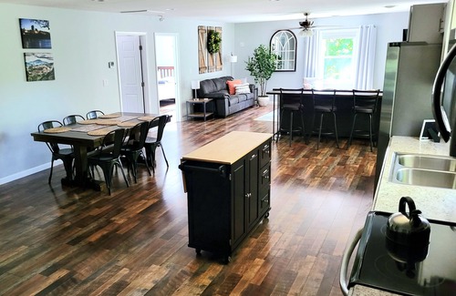 This charming retreat is equipped with everything you need for a memorable event. Enjoy high-speed Wi-Fi and dedicated workspaces if you need to catch up on anything before or after your wedding. The open-concept design boasts a large kitchen table ideal for gatherings, two Samsung Smart TVs for entertainment, and cozy Tuft and Needle Queen beds for restful nights. In addition, the outdoor space features a new fire pit, perfect for intimate gatherings under the stars, and a playset to keep little ones entertained during your festivities.