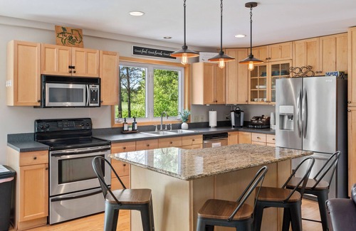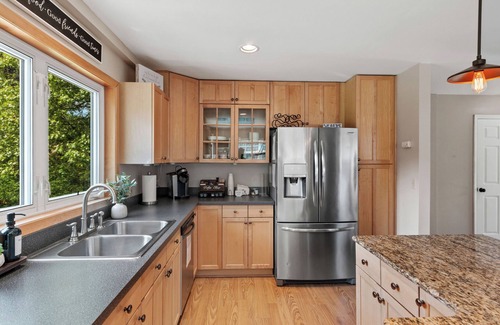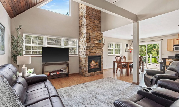 Step inside our inviting home, and you'll find a comfortable and stylish living room featuring a cozy gas fireplace, perfect for gathering and unwinding after a day of adventure. The fully equipped kitchen allows you to prepare delicious meals, with modern appliances and ample counter space for your convenience.