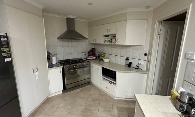 Relax as a couple at this peaceful place stay. Room is fitted with a luxurious plush queen bed with built in robes and storage. Off the room is the main bathroom and laundry. Access to a media room and super fast wifi and a large entertainment area in backyard. The Large gourmet kitchen with chef's oven and own walk-in pantry can stow your food and beverages in a large fridge freezer. Train and shopping centre is only 3.5kms away. North, Calder Park thunderdome 5kms away. You will love a stay in this cozy, tranquil, quiet hustle stay.