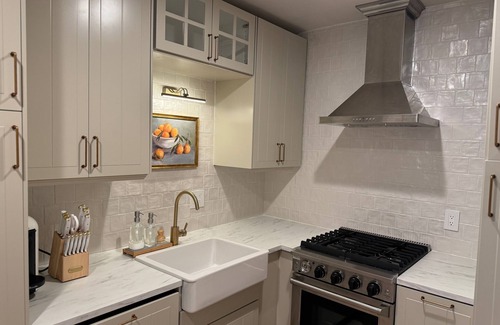 The fully equipped kitchen features paneled appliances, an exposed brick accent wall, and a stunning zellige-style tile backsplash, perfect for creating your favorite meals in style. Modern conveniences, including a washer and dryer, a smart TV, and luxury amenities, ensure every detail of your stay is effortless and enjoyable.