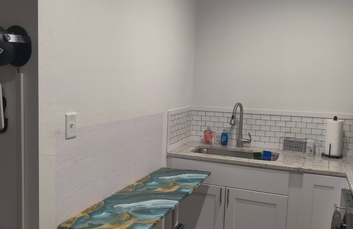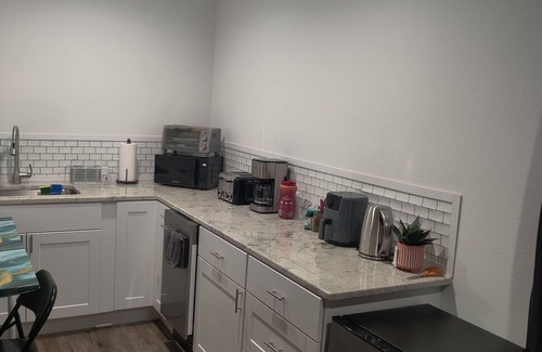 Unwind in this cozy, fully equipped studio designed for stress relief and deep relaxation. Enjoy soothing nature audio, including gentle thunderstorms, rainbow mood lighting, a Cal king bed, retro games, AM/FM radio, smart TV, and a full kitchenette with air fryer, toaster oven, dishwasher, hair dryer, closet, iron, microwave, and coffee pot. With a private shower, washer/dryer, and peaceful ambiance, this tranquil retreat offers everything you need to recharge and reset.