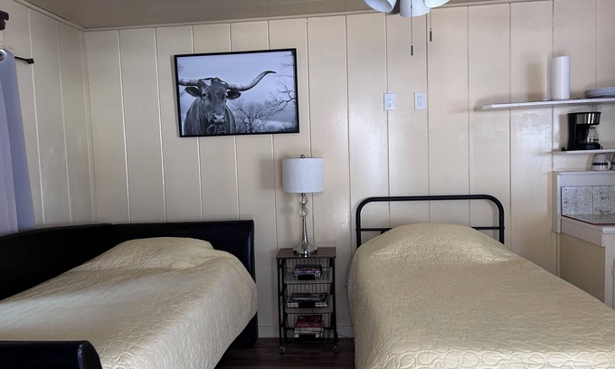The ranch studio apartment includes two twin beds, a full bath, and half kitchen. Pets are welcome upon pre-approval from the on-site manager. No pets are to be left unattended. There is a pet fee $25 per night (that will be collected upon arrival). We offer a 12x12 dog kennel.