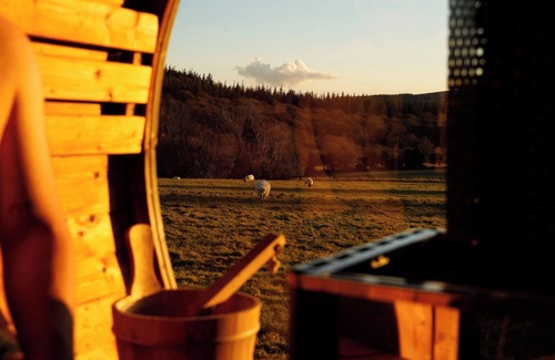 Welcome to our luxury off-grid Tigín, a handcrafted tiny house nestled on 70 acres of pasture, bog, and native woodlands in the heart of Wicklow. With expansive windows offering views of wildlife, a cozy mezzanine kingsize bed, a fully equipped kitchen, and a rustic wood-fired sauna, the cabin is designed for comfort and immersion in nature. Accessible via a 300m meadow hike (wellies recommended), the solar-powered Tigín features natural materials, Irish-crafted decor, and eco-friendly amenities like a dry toilet and well-filtered water. Explore nearby attractions like Glendalough, Brittas Bay, and Avoca, or simply enjoy the serene surroundings.
