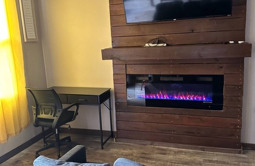 Inside, you’ll find a fully equipped modern kitchen with a refrigerator, 2-burner stove, microwave, and a versatile convection oven that doubles as an air fryer and indoor grill. The cozy living area is anchored by an electric fireplace and features a 50" flat-screen TV with excellent WiFi, making it perfect for both relaxation and remote work.