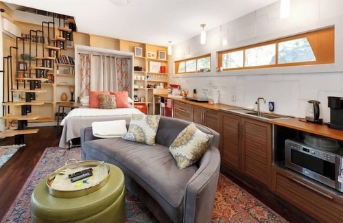 Tranquil waterfront retreat on a peaceful spring fed pond, this Dog Friendly cottage has unique style, deck with grill & smokeless fire pit-wood provided-shady deck and rockers, lounge chairs and kayaks on your private dock. Full Murphy bed in living room with electric"wood" stove & queen bed in the loft. Trails through 68 acres of forest and meadow lead to 300 state acre forest. Two adjacent guest homes share the pond and sandy beach, message for available dates for all 3 for perfect privacy.