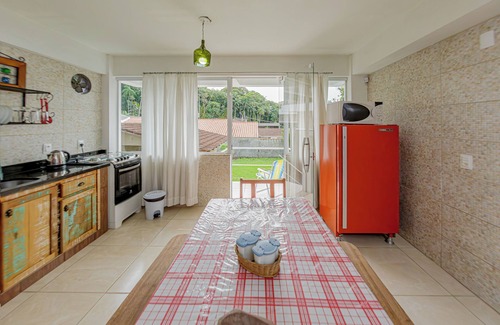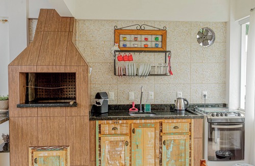 - Cozinha: equipada com todos os utensílios e eletrodomésticos necessários para preparar e servir suas refeições preferidas no local. Disponibilizamos utensílios de preparo para o churrasco, como espeto, tábua, faca e garfo grandes.