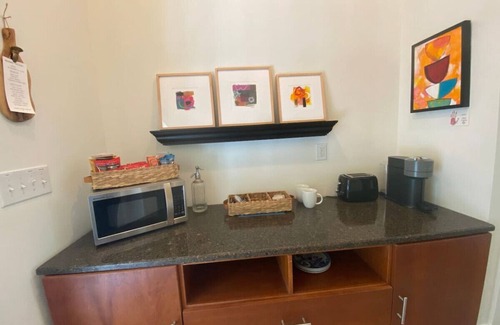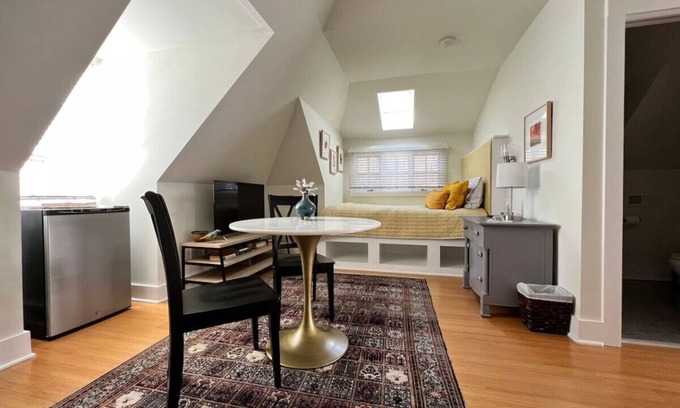 Welcome to Tranquility, a studio apt. with Tesla EV charging station. Our cozy (perfect for 1-2 guests), well appointed studio is located above a detached garage (with an ultra quiet garage opener) w/separate entrance on the same property as our single family home in Old Irving Park in Greensboro. Enjoy complete privacy in a safe, quiet, wooded setting and still be close to restaurants and shopping. Ample parking in the driveway or on the street. We're pet friendly too!