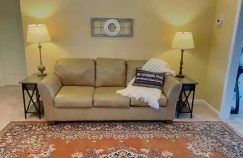 Your stay at Tranquility includes a variety of amenities designed for relaxation and enjoyment. Unwind on the deck that overlooks a lush greenbelt, or savor your morning coffee on the quiet front porch. The master bedroom features a king bed with an attached bathroom and a spacious walk-in closet, ensuring a restful night’s sleep. With two additional bedrooms and a second living room equipped with a 55" Smart TV, there’s ample space for family and friends. For your convenience, a washer and dryer are also available on-site, allowing you to pack light and focus on your celebrations.