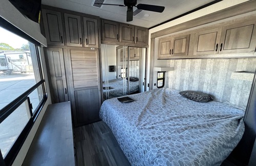 Travel trailer rental, used for long term stays. Can not be moved from site. Cottage by Cedar Creek camper trailer; has a refrigerator, stove, dishwasher, wet bar, theater seats, televisions in living and bedrooms