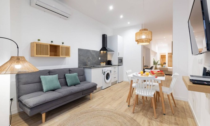 Travel Habitat Ruzafa Lofts are a collection of cozy and charming studio apartments in the heart of the Ruzafa neighborhood in Valencia. Travel Habitat Ruzafa Lofts combines warm décor inspired by the Mediterranean Sea and is the ideal place for those seeking comfort and a welcoming atmosphere in one of the most picturesque neighborhoods in the city of Valencia. Located on the ground floor with independent access. The excellent location of Travel Habitat Ruzafa Lofts, in the Ruzafa neighborhood, perfectly combines residential tranquility with proximity to Valencia\'s main attractions, such as the City of Arts and Sciences, the city center, Plaza del Ayuntamiento, Mercado de Colón, etc. Travel Habitat Ruzafa Loft 5 is a loft apartment with a maximum capacity of 4 people, with 1 double bed in the common area and 1 double bed in the bedroom with a fan. The apartment is fully equipped with: Smart TV, free Wi-Fi, washing machine, refrigerator, induction hob, coffee maker, microwave, toaster, kettle, and necessary kitchen utensils. The apartment has a bathroom with a shower, toilet, and toiletries. Travel Habitat will provide all occupants with bedding and towels during their stay.