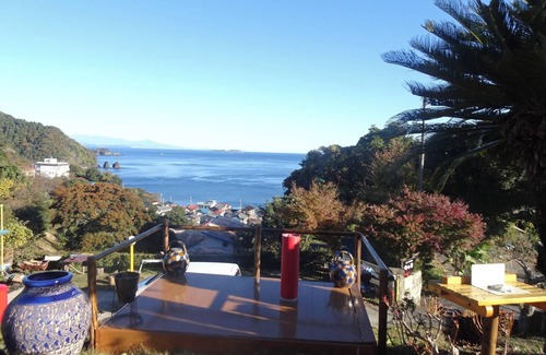 A traditional Japanesestyle rental villa with views of Hatsushima Island and the sea
