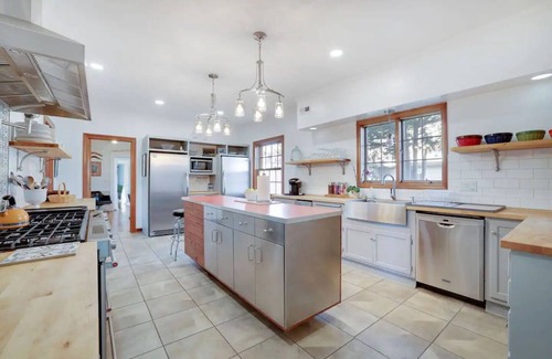 This magnificent house features 6 spacious bedrooms along with a versatile convertible sofa bed, making it ideal for accommodating everyone from babies to grandparents. You will appreciate the generous bathrooms, including two full restrooms on the second floor and one on the first floor, ensuring convenience for all guests. The kitchen is a culinary haven, outfitted with ample counter space and large appliances to make meal preparation seamless, whether you're hosting a cozy dinner or a grand wedding feast. Enjoy quality time in the expansive dining room and living area, where laughter and stories can be shared until the late hours. Amenities like high-speed WiFi, Netflix, and indoor gas fireplaces enhance your stay, allowing for relaxation and entertainment amidst the wedding festivities.