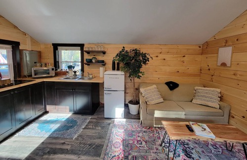 Enter the cabin, kick off your hiking boots, and grab a fresh glass of spring water! A filled jug sits ready for every guest. The kitchen is perfectly appointed with an electric stove top, a toaster oven, a microwave oven, fridge with freezer and a Keurig coffee maker.