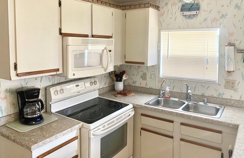 Our bright and comfortable manufactured home is conveniently located just a short walk to the beach and pool. For your own enjoyment, our unit provides an outdoor patio equipped with shade covering, seating and electric grill. A bathhouse is located right out our door making this rental a prime location for you. For those times you need to do laundry, our unit has full-size washer and dryer.