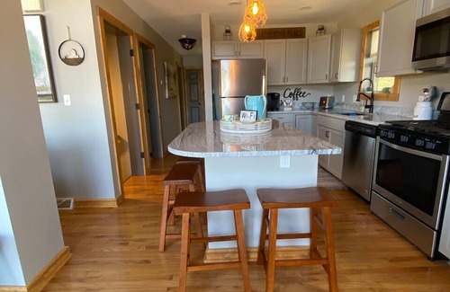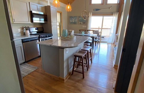 The first floor features a great room with cathedral plank ceilings, large chalet windows for lots of sun, an updated kitchen with stainless appliances, glass doors that open to a large deck overlooking the lake with outdoor seating and a propane grill, a full bath, and 3 bedrooms. Three sets of deck stairs go down to the yard, the driveway, hot tub area, and the Lakeview fire pit. Be sure to bring your firewood and smores!