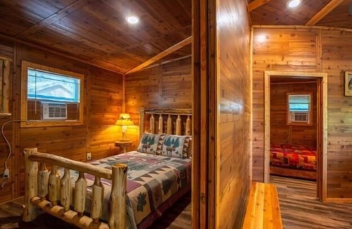 Deluxe Cabin (with Bathroom) - Sleeps up to 8 people. Tree House Imagine glamping with a real trees growing in the center! No worries about climbing steps, this is a ground level tree house! 2 bedrooms with linens provided, Handicap Accessible. Full bathroom with shower, Kitchen with stove top and full size fridge. Dishes and cookware provided. You'll love the dishwasher ice maker too! This cabin does not allow pets.