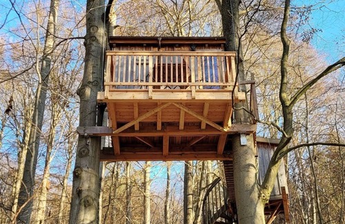 Tree house Sollingblick, living/bedroom - Baumhaushotel Solling is located in Uslar. Tree house Sollingblick, living/bedroom - Baumhaushotel Solling provides accommodation, featuring Fireplace/Heating, Breakfast, Barbecue/Outdoor Cooking, among other amenities. This Apartment features Fireplace/Heating, Breakfast, Barbecue/Outdoor Cooking, to make your stay a comfortable one.