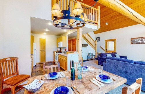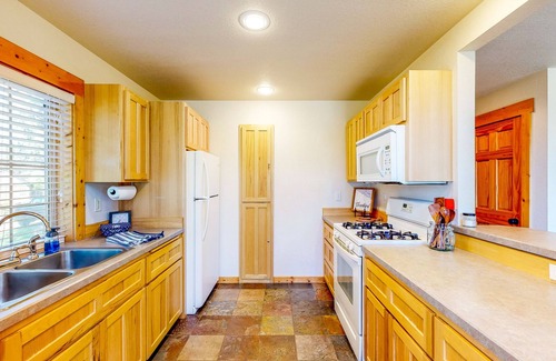 Inside, find yourself relaxing on the comfortable seating in the living room, tuned into your favorite TV show (Apple TV provided), and warmed by the heat of the fireplace. The adjacent well-equipped kitchen presents a pleasant space to whip up culinary creations, and when you're ready to eat, dine family-style at the large dining table.