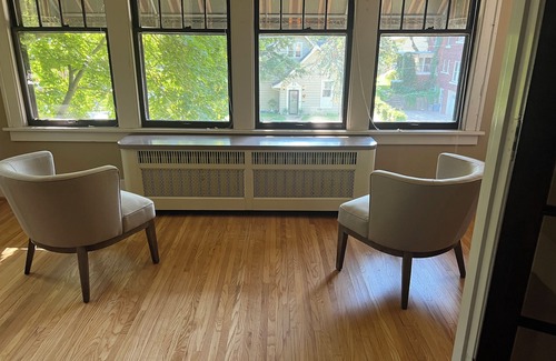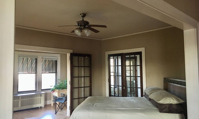 This 1920's two flat across the street from the Rock River is just minutes from downtown Dixon, the bike trail, Nachusa Grasslands, White Pines, Castle Rock and Franklin Creek State Park! The second story unit has it's own entrance and offers spectacular river/tree top views. The unit includes a kitchen, bathroom, dining room, bedroom, sunroom, den, along with a yoga/workout room with roll out futon and bedding . Long Term rentals of more than 5 days are limited to 1 person. The space has lots of windows and natural light along with an open floor plan. Den has a roku smart TV and high speed wi-fi . There is a separate washer and dryer in basement for the upstairs unit. Guests can sit out on side patio. Grill available.