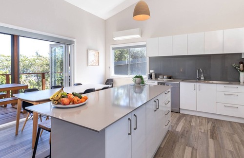 The home boasts modern, light and bright open plan living areas with plenty of ceiling to floor glass windows allowing the sun light to shine through and provide guests with views across the Tree Tops of Smiths Lake. The kitchen is fully equipped with everything you could require to cook up a storm. There is air conditioning and also a wood fireplace for those cooler nights (initial bag of wood supplied during Winter).