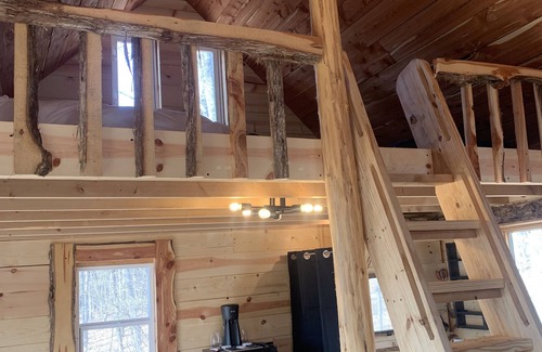 Enjoy the lovely setting of this romantic spot in nature, with a semi-primitive, modern cozy secluded treehouse in the woods! Explore 10 acres or wind down on the deck before relaxing in the hot tub. The inside has a very minimalistic design featuring on the first floor an electric fireplace, air conditioner, table, leather futon couch, kitchenette with a hand crank water pump sink and porta-potty bathroom. The upstairs loft is a romantic cozy getaway itself for any couple!