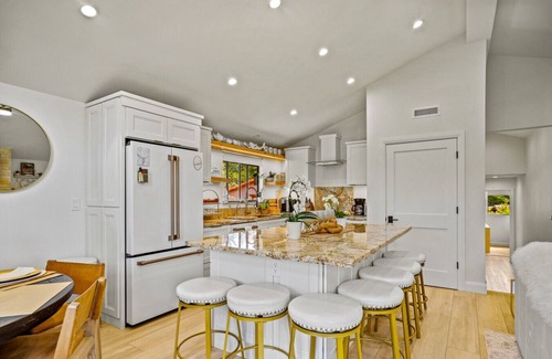 The kitchen area is filled with natural light and open to the living and dining area. There is a gas range, oven, double-drawer dishwasher, large, french door refrigerator, microwave, and farm-style sink. The dining table seats four, plus there are six bar top seats around the kitchen island.