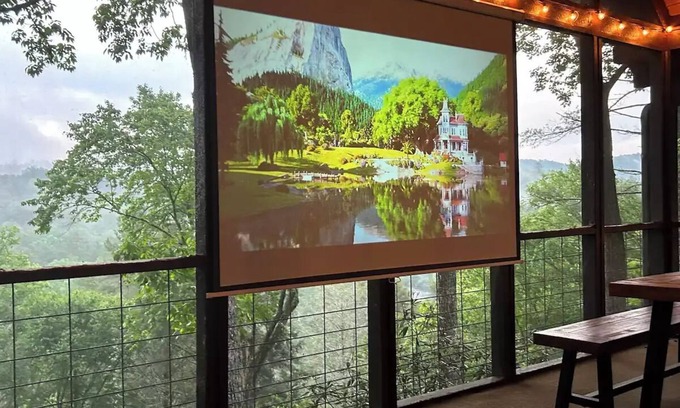 Enjoying the fresh mountain air is as easy as stepping out onto the screened-in porch off of the main living area. This area has clear views of the mountains, and you can see and hear the beautiful Toccoa River. The screened-in porch has a picnic table with cozy outdoor seating overlooking the river. Enjoy using the gas grill (connected to the main gas line) to make delicious BBQ or enjoy a movie on the outdoor 100" movie screen using the DVD player. While grilling, enjoy a fun-filled game of cornhole on the deck.