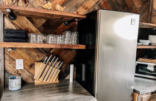 This cabin was hand crafted. The ceilings are milled walnut from northern Indiana. The pallet wood is untreated from Kentucky. The cabinets and shelves were custom built for this cabin and the stair rail was built from trees from this very property.