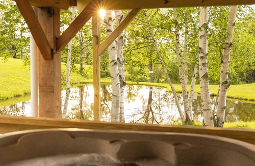 The Pond Treehouse has a sauna just a few yards away!! The private hot tub is also directly under your porch!! The pond is right there out front and we invite you to come swim or skate depending on the season!!