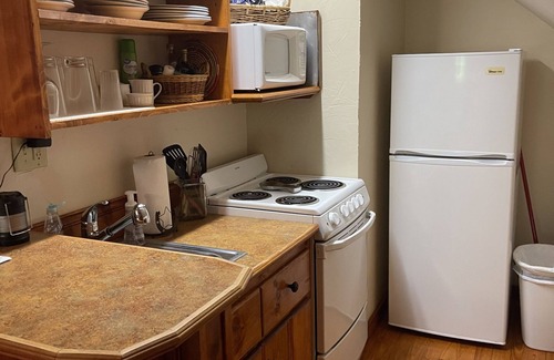Treehouse is located in a forrested section of a 56 acre ranch. It is a cozy upstairs getaway with a queen bed, sitting area, full kitchen and bath, with a commanding view of the eight acre Lake below. Situated on the second floor of a detached carriage house garage the Treehouse offers a private deck where guests can sit and take in the spectacular views of the lake. The many windows that overlook the woodlands and lake give it that treehouse feel. The guests also have a private stone patio and grill. Accommodations at Treehouse are first class. All bedding including quilts and comforters are washed between every booking.
