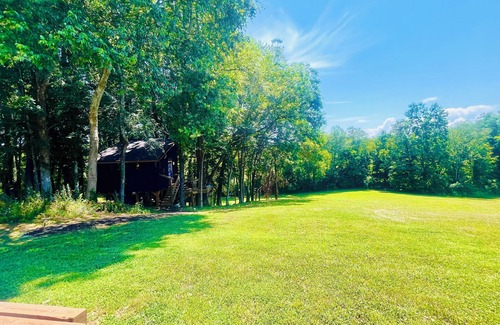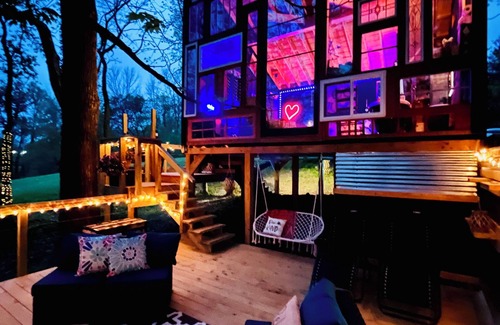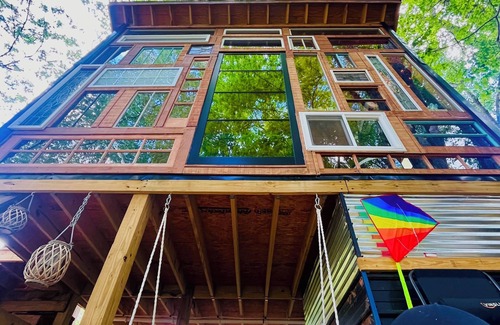 You'll love this captivating treehouse nestled quietly in the woods, surrounded by seasonal wildflowers. This Treehouse is a one of kind eclectic experience. You’ll find yourself immersed in total relaxation with plenty of books, games, a record player with all the best old school Vinyls. You will be surrounded by plenty of mood lighting to fit the music and enhance the vibe. Take a step outside and relax in the french hammock or take advantage of the lower deck and watch the day disappear.