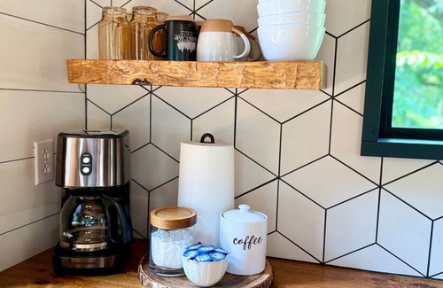 Grab a blanket and cozy up next to the modern gas fireplace for those cool evenings. There’s a skylight just above the king size bed for night sky gazing with a remote solar shade to keep you sleeping in the wee morning hours. A rain shower for two in the walk through bathroom including a relaxing soaking tub and plush robes for your comfort. The kitchen offers an indoor/outdoor coffee bar and tiny appliances for all your cooking needs. Outdoors you'll find a hot tub placed sweetly next to towering Eastern Red Cedar trees with a privacy fence, a separate deck for grilling or nesting in the trees and fire-pit below with ambient lighting for smores or story telling!