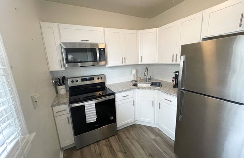 Fully equipped with a refrigerator, stove, oven, microwave, and all the basic kitchen essentials; Pots/Pans/Plates/Cups/Utensils