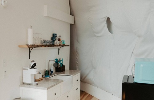 Step into the world of glamorous camping as you enter our geodesic dome. The interior exudes elegance and comfort, combining modern amenities with the beauty of the great outdoors. Relax in the spacious living area adorned with stylish furnishings, perfect for unwinding after a day of adventure. Large windows and skylights allow natural light to fill the space, creating a warm and inviting atmosphere.