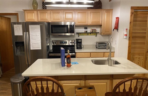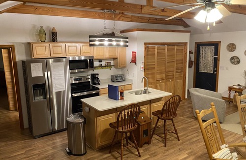 The casual atmosphere is ideal for family vacations or a romantic retreat. Sit on the covered porch and enjoy the beautiful sunsets or in front of the stone fireplace by a cozy wood burning fire. The great room with its high ceiling and many windows allows you to enjoy the outdoor views. The wrap around deck provides seating areas on all sides of the house where you can see a herd of deer that cross the property almost every morning and evening.