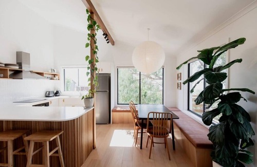 With a neutral colour palette and timber accents, you'll be greeted by a cozy living space bathed in natural light and earthy tones. The open-plan layout connects the living, dining and kitchen areas allowing guests to unwind, cook and hang out after busy days exploring Hobart.