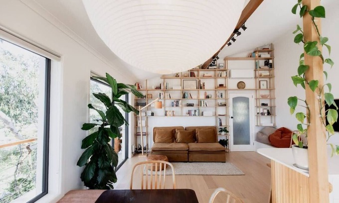The living room is furnished with comfy couches and timber joinery filled with books for guests to enjoy. Large windows allow natural light to flood the space, where guests can enjoy views of the Derwent. The apartment is surrounded by large gum trees creating a peaceful, leafy vista.